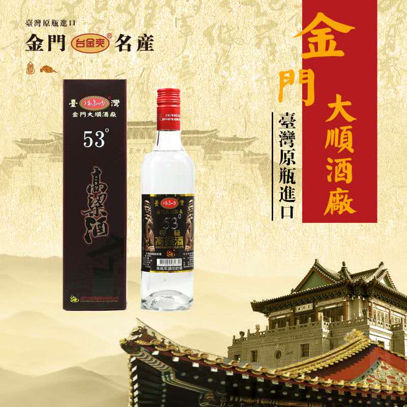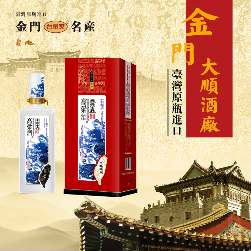 金門大順酒廠,座落于金門北緯24.5度,地處海隅,濱大陸,得天獨厚的地理,使它擁有絕佳的水質(zhì)、空氣、氣候及原料的四大天然釀酒條件。金門大順酒廠的高粱酒釀造是利用金門特產(chǎn)『旱地高粱』、引用當(dāng)?shù)厮|(zhì)甘甜的泉水、金門潔凈的空氣與氣候條件,并承襲傳統(tǒng)古法之釀酒技術(shù),加上獨家的釀酒專業(yè)技術(shù)經(jīng)驗【三離二鍋一翻】的發(fā)酵釀酒工藝,經(jīng)掐頭去尾后入庫,去蕪存菁。而造就出金門大順酒廠的高粱酒特色「清澈透明、質(zhì)地純凈、芳香濃郁」之一系列高粱酒。金門大順酒廠制酒承襲著金門得天獨厚的地理環(huán)境,加上三代流傳之古法醇釀技技術(shù),結(jié)合經(jīng)驗與現(xiàn)代化生產(chǎn),釀出風(fēng)味獨特,香、醇、甘、冽的【臺島】【臺金爽】【牛樟芝高粱酒】【龍騰鳳舞】【紅雙十】【陳高吶】【臺灣小酒】等多樣系列產(chǎn)品。真實原味、清香散發(fā),甘冽醇厚的絕佳風(fēng)味。